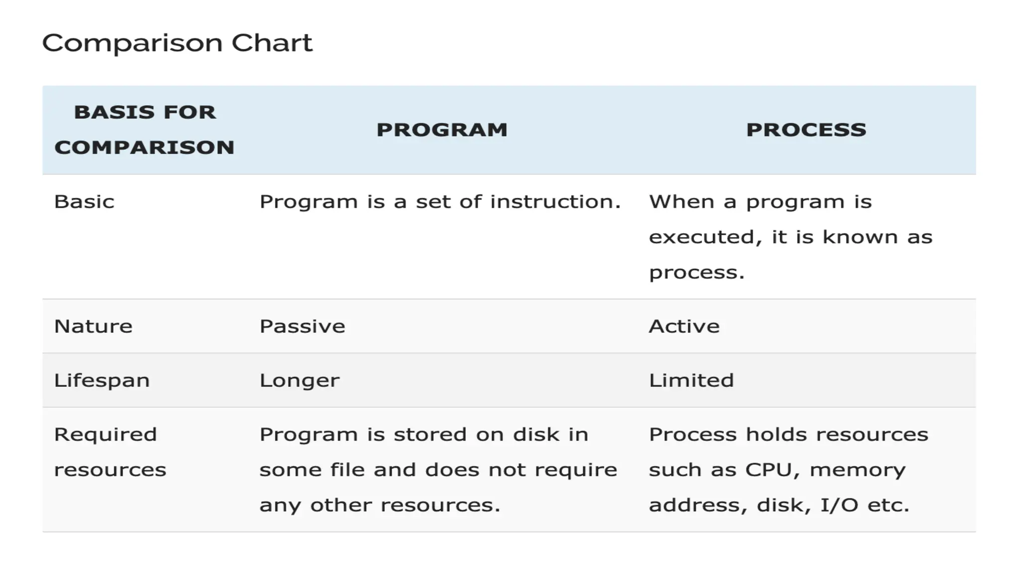 The resource requirement is much higher in case of a process; it could need processing, memory, I/O resources for the successful execution. In contrast, a program just requires memory for storage.