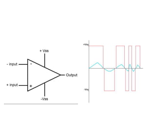 An operational amplifier (op-amp) is a differential amplifier that takes the difference between two input voltages and amplifies it. It can amplify very small voltage signals to a useful level. The op-amp is typically an 8-lead integrated circuit that requires a positive and negative power supply. The degree of amplification can be controlled using feedback, which is most commonly applied to the inverting input as negative feedback. The gain is determined by the formula Gain = 1 + (Rf/Rin). Some common op-amp configurations include the voltage follower, comparator, and non-inverting amplifier.