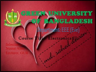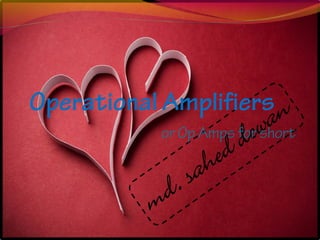 This document describes operational amplifiers (op amps) and their applications. It defines key parameters of ideal and real op amps like voltage gain, input resistance, and output resistance. Circuits like voltage comparators and inverting amplifiers are analyzed. The summary explains that an ideal op amp forces its input voltages to be equal while a real op amp output is limited between power supply voltages but still aims for zero difference between inputs. Common op amp applications include audio amplification, instrumentation, and analog computing.
