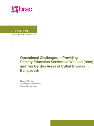 This document summarizes an operational study conducted in eight marginalized upazilas of Sylhet Division in Bangladesh that have consistently underperformed in education and other development indicators. The study examines challenges faced in providing primary education services in wetland (haor) and tea garden areas. Major challenges identified include difficulties finding proper school infrastructure and qualified teachers, high teacher turnover, and barriers to education like seasonal work, weather, and household responsibilities that impact student attendance and dropout rates. Educational monitoring is also hindered by poor communications, limited staff training time, and heavy workloads. Recommendations focus on increasing spending on schools, teacher salaries/training, and deploying more qualified educational staff.
