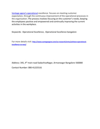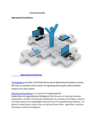 Vantage Agora offers a comprehensive insurance operational excellence service, successfully migrating clients' policy administration systems while focusing on continuous improvement of operational processes. The approach emphasizes meeting customer expectations and enhancing key performance metrics through data-driven methods, including algorithms and AI. The service fosters a positive workplace by empowering employees and addressing customer needs.