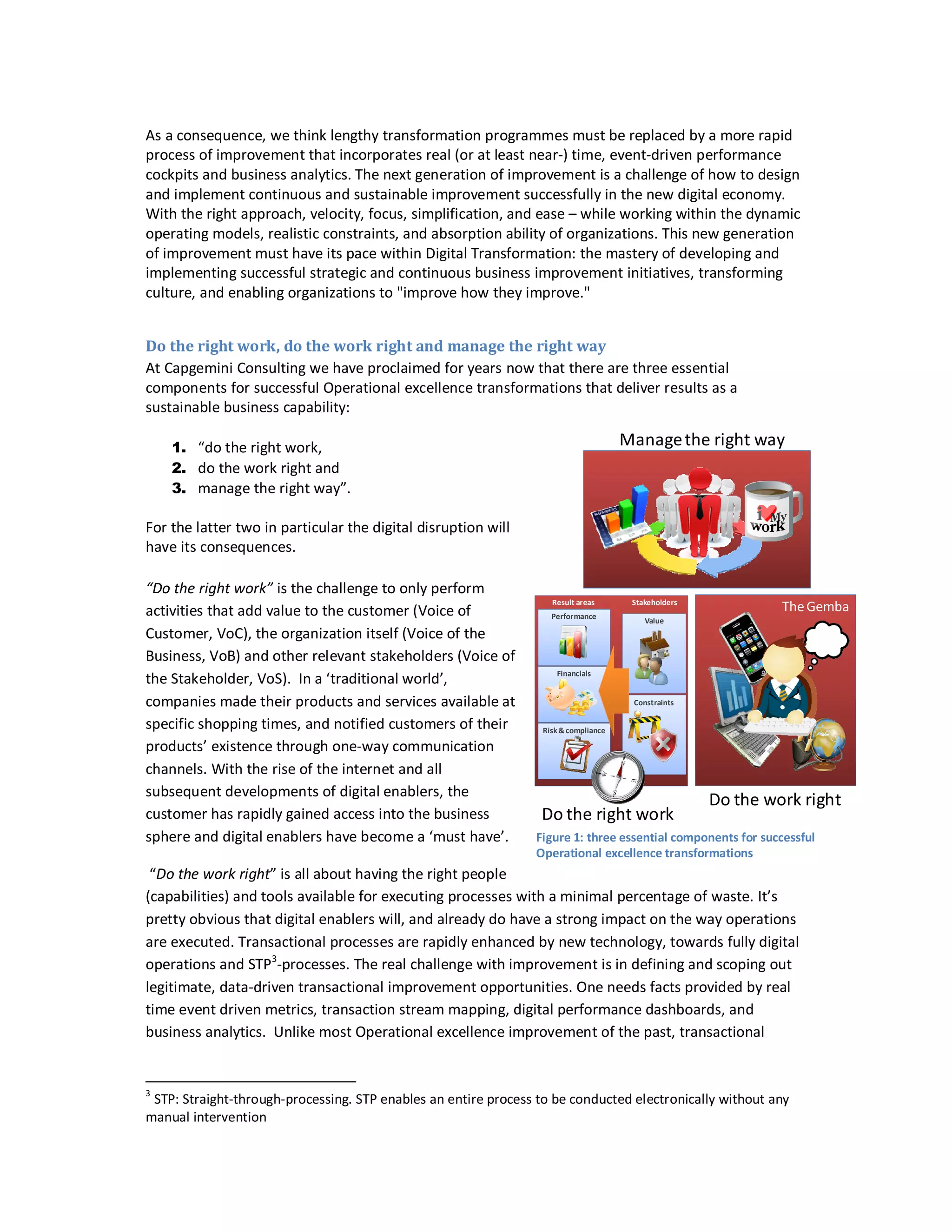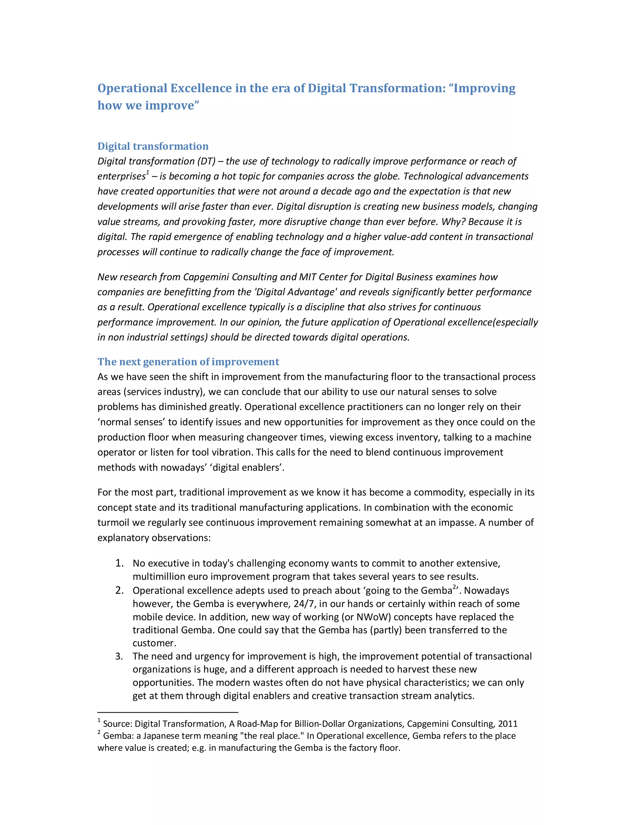 The document discusses how operational excellence needs to adapt to the digital transformation era. Traditional improvement methods are no longer sufficient and must blend with digital enablers. The future of improvement lies in rapid, event-driven processes supported by real-time analytics and business intelligence from digital data. To succeed, organizations need an approach that focuses on designing digital operations, simplifying processes, and implementing continuous improvement at the right pace of digital transformation. Leadership is also key to drive cultural change and commitment to continuous improvement as the standard for excellence.