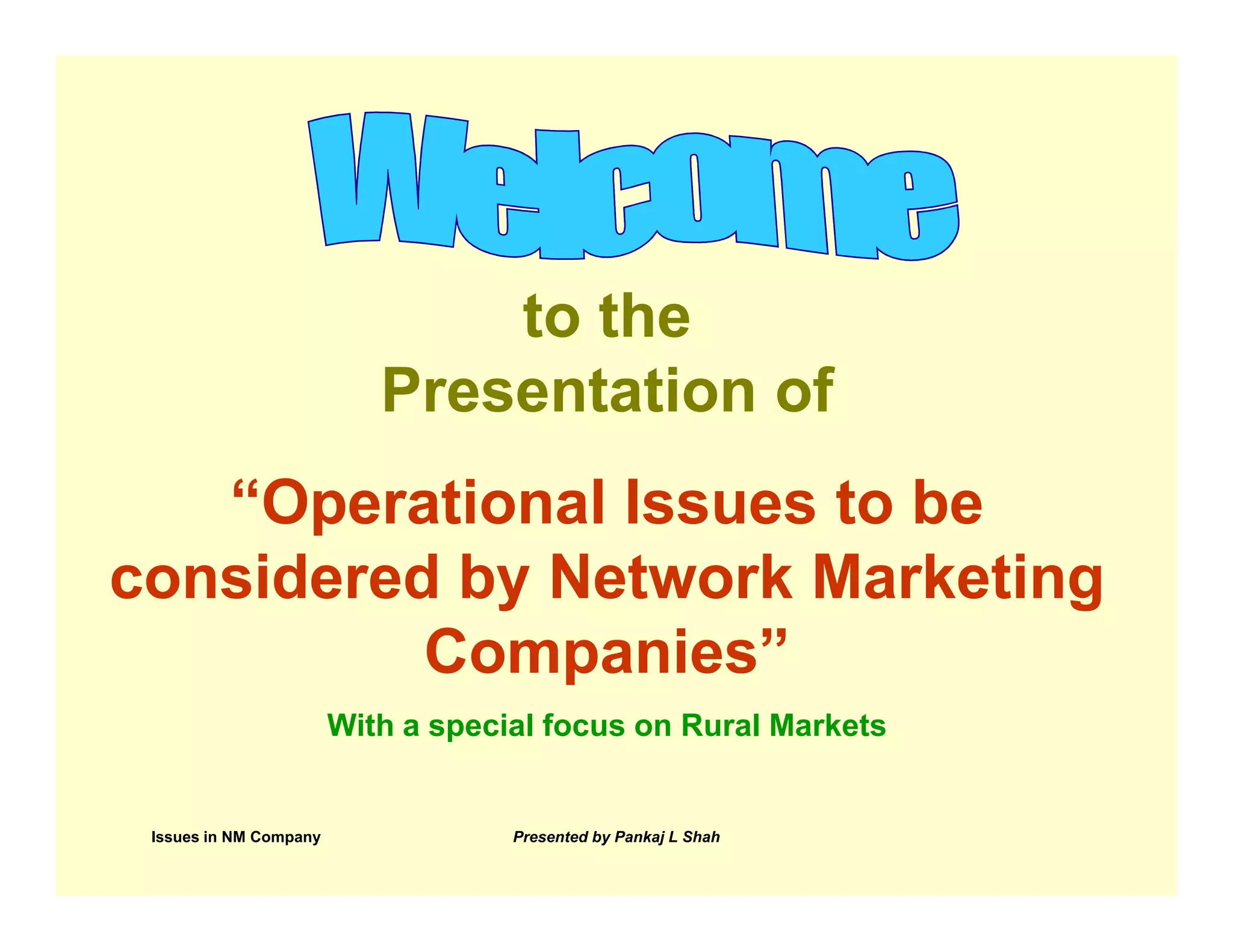 The document discusses operational issues for network marketing companies, especially those targeting rural markets. It covers topics like capital requirements, risks, infrastructure needs, and business skills required. It then discusses the advantages of network marketing like low capital needs, low risks, and immediate income. Specific issues covered include company formation, VAT registration, banker selection, product selection and distribution challenges in rural areas, commission plan and payment options, and network development challenges. The presentation argues that an ideal network marketing company forms a synergistic association with those who think and dream differently.