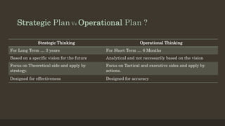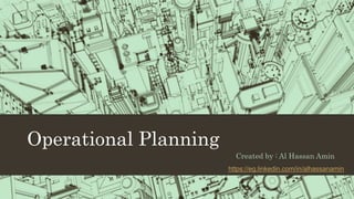 Operational planning involves short-term tactical actions to achieve strategic goals over a 6-month period. Key steps in operational planning include performing a SWOT analysis to identify internal strengths and weaknesses and external opportunities and threats. Goals are then formulated using the SMART framework and means or actions are identified for each goal. A work schedule, timetable, and budget are created to monitor progress. The plan should be regularly reviewed and updated through re-planning.