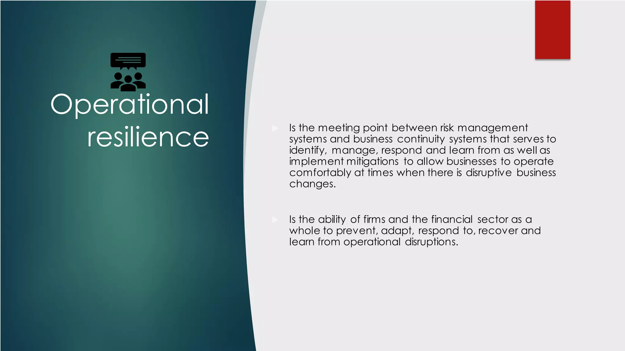 Operational resilience aims to increase a firm's ability to prevent, adapt to, respond to, and recover from operational disruptions through various means. This includes identifying important business services, setting impact tolerances, stress testing scenarios, communication plans, and lessons learned. Governance and assurance are also important to demonstrate meeting responsibilities. Outsourcing requires understanding all resources supporting business services, including those outside a firm's direct control.