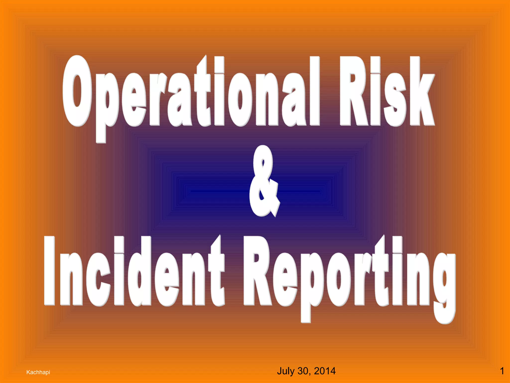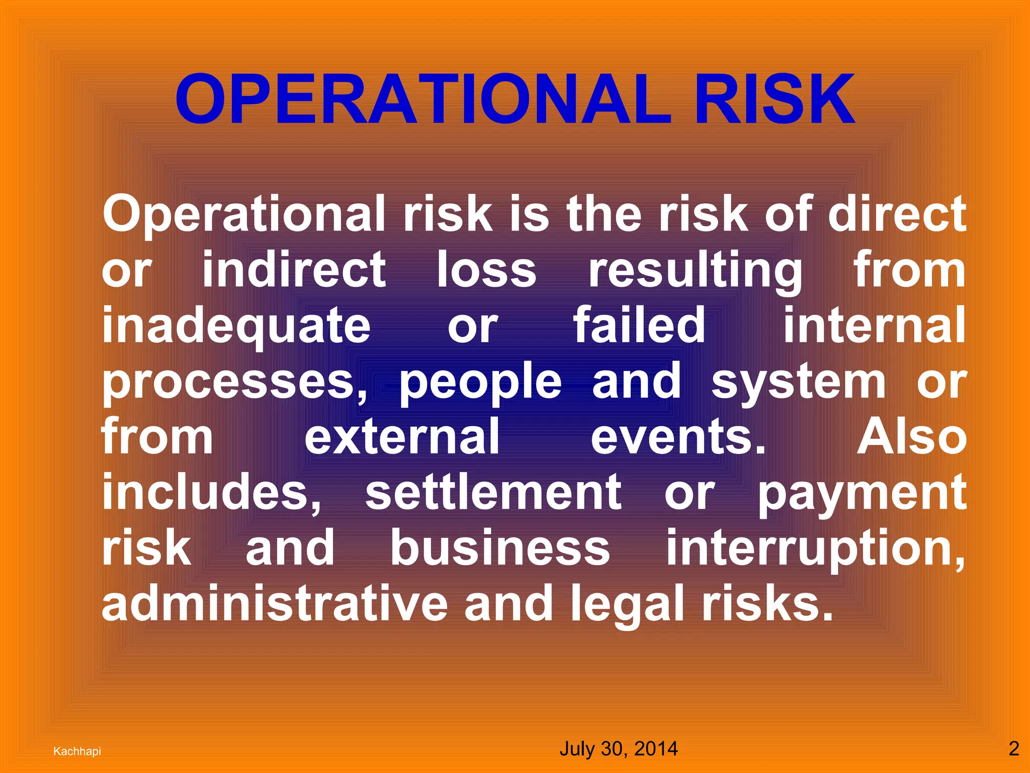 Operational risk is the risk of loss from failed internal processes, people, systems or external events. It is embedded in all bank activities and processes. Major types of operational risk include internal and external fraud, workplace issues, damage to physical assets, business disruptions, client/product issues, and legal risks. Common operational risk events in banking include losses from internal fraud, external fraud, improper sales practices, physical damage, system failures, and failed transaction processing. The document outlines approaches for quantifying and measuring operational risk, including the Basic Indicator Approach, Standardized Approach, and Advanced Measurement Approach. The Advanced Measurement Approach, which uses internal loss data and assessment methods, is most beneficial for banks.