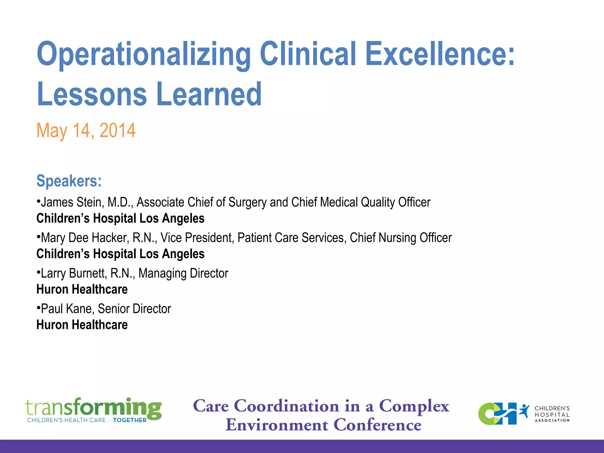 Children's Hospital Los Angeles faced financial challenges under new DRG-based reimbursement and embarked on an organization-wide transformation. Key initiatives included improving clinical operations through initiatives like standardized patient placement, interdisciplinary care coordination, and reducing clinical variation. Governance was strengthened with a defined leadership structure and patient flow meetings. Enabling technologies such as an optimized bed board and case management system were implemented to improve operations. Tracking progress showed benefits like reduced length of stay, increased capacity to serve patients, continued decreasing mortality trends, and improved financial and patient satisfaction outcomes. Lessons learned emphasized focus on quality, leadership engagement, communications, and strategic technology investments.