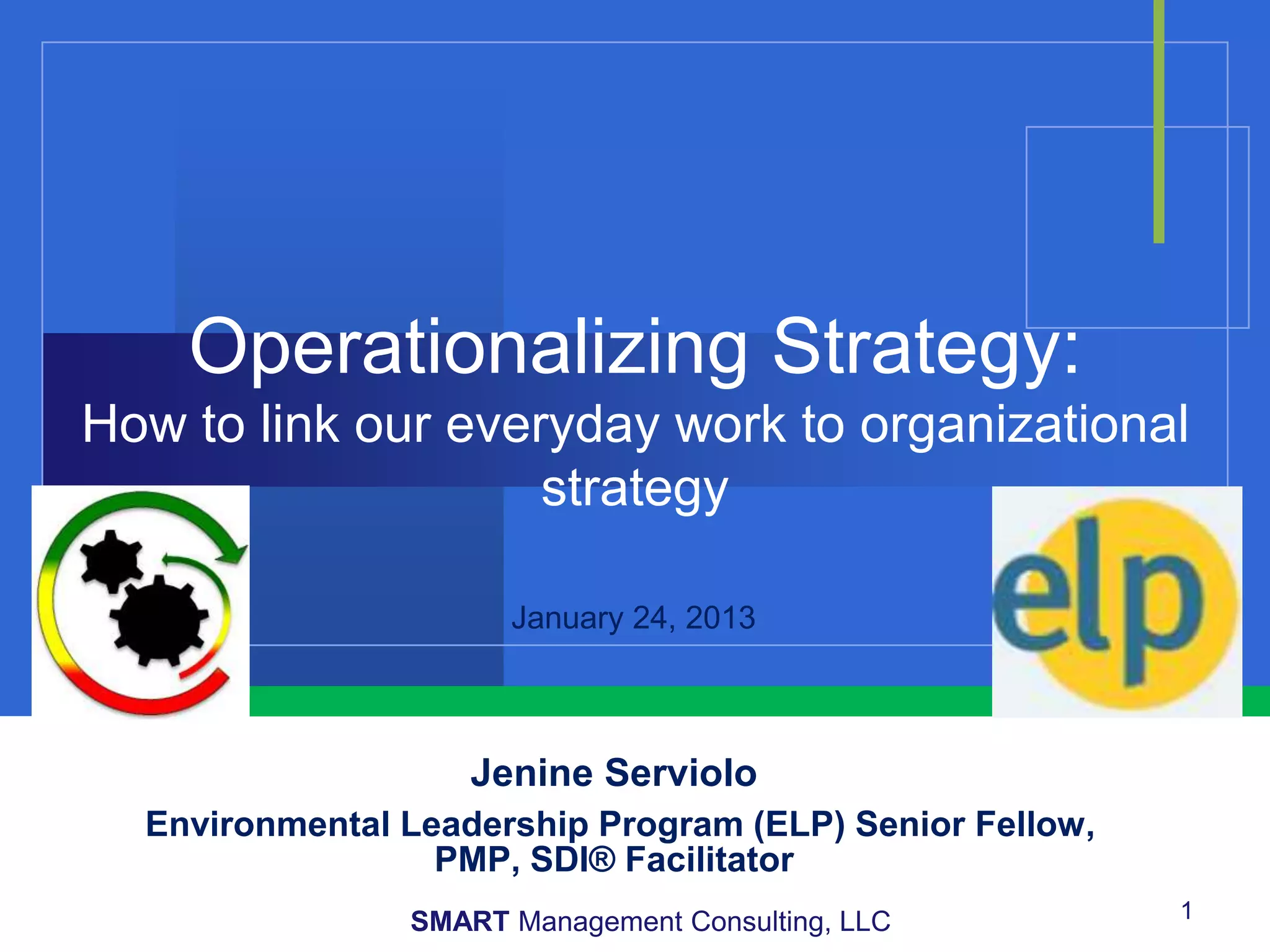 This document provides an overview of operationalizing organizational strategy through linking everyday work to strategic goals. It discusses defining strategy, assessing individual commitment to strategy, and linking work efforts to strategic results through cause-and-effect relationships. Key points include understanding one's role in achieving the organizational mission and vision, building strategy commitment, and ensuring initiatives, projects and programs deliver intended benefits to meet strategic objectives.