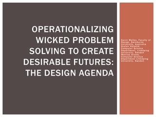 This document discusses operationalizing solutions to wicked problems through collaboration and design techniques. It references the 1973 paper by Rittel and Webber that defined wicked problems. The document outlines methods used in a case study, including personas, scenarios, and participatory design, to address issues like health and independence for seniors. It argues that positioning Simon vs Rittel/Webber is a misunderstanding and that their approaches are compatible when addressing contingent real-world problems through feedback systems and artifacts.