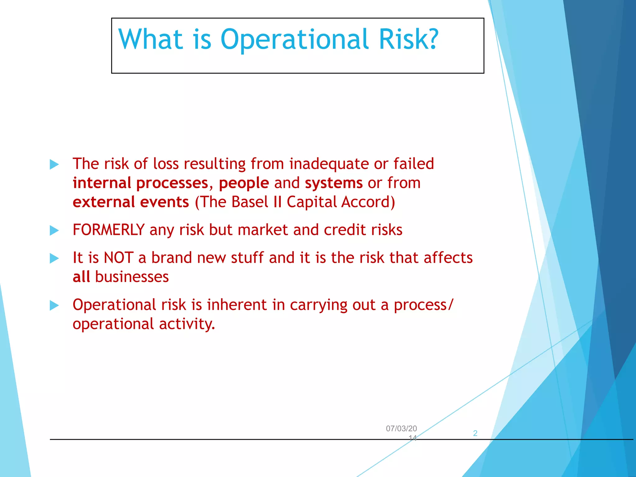 Operational risk can result in losses from internal failures or external events. It is classified based on frequency and impact of events. Management typically focuses on low frequency/high impact events and high frequency/low impact events. The Basel Accords define three approaches to operational risk capital requirements: Basic Indicator, Standardized, and Advanced Measurement. The Standardized Approach divides business activities into eight lines and assigns a beta multiplier to each line's gross income. The Advanced Measurement Approach uses banks' internal models to calculate regulatory capital.