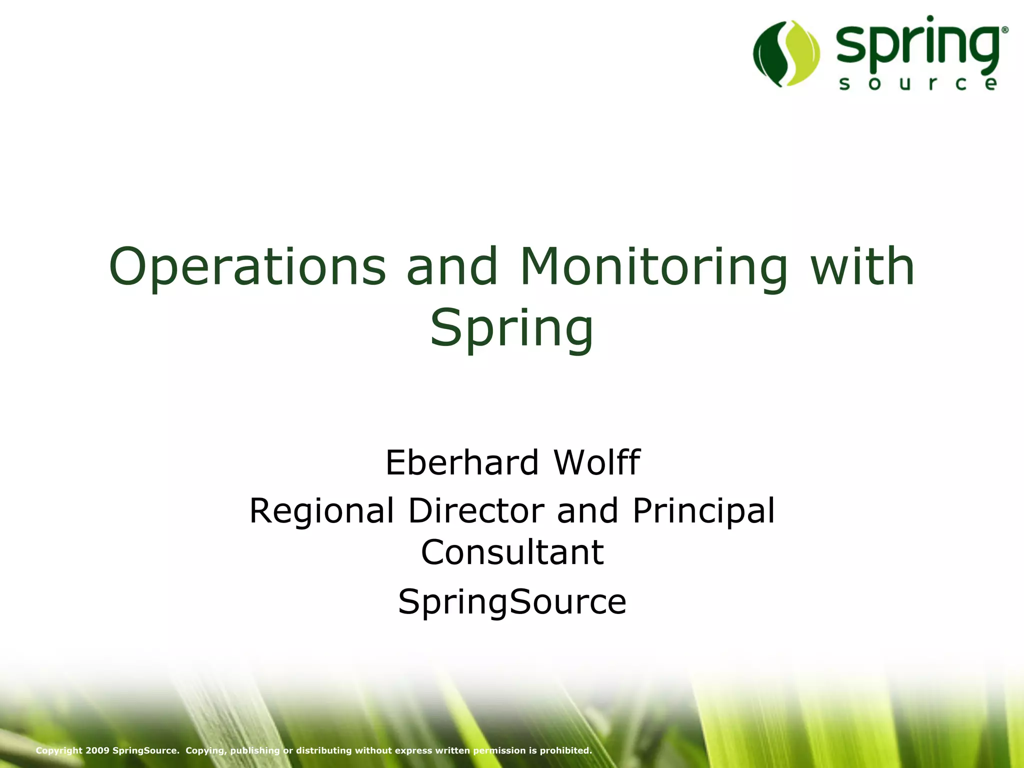 The document discusses Spring and Java EE application development. It describes Spring as a programming model that defines APIs but no infrastructure, allowing applications to run on servlet containers like Tomcat without needing full Java EE application servers. It also summarizes Spring tools for operations and monitoring large clusters, and how OSGi modularization allows updating parts of applications at runtime.
