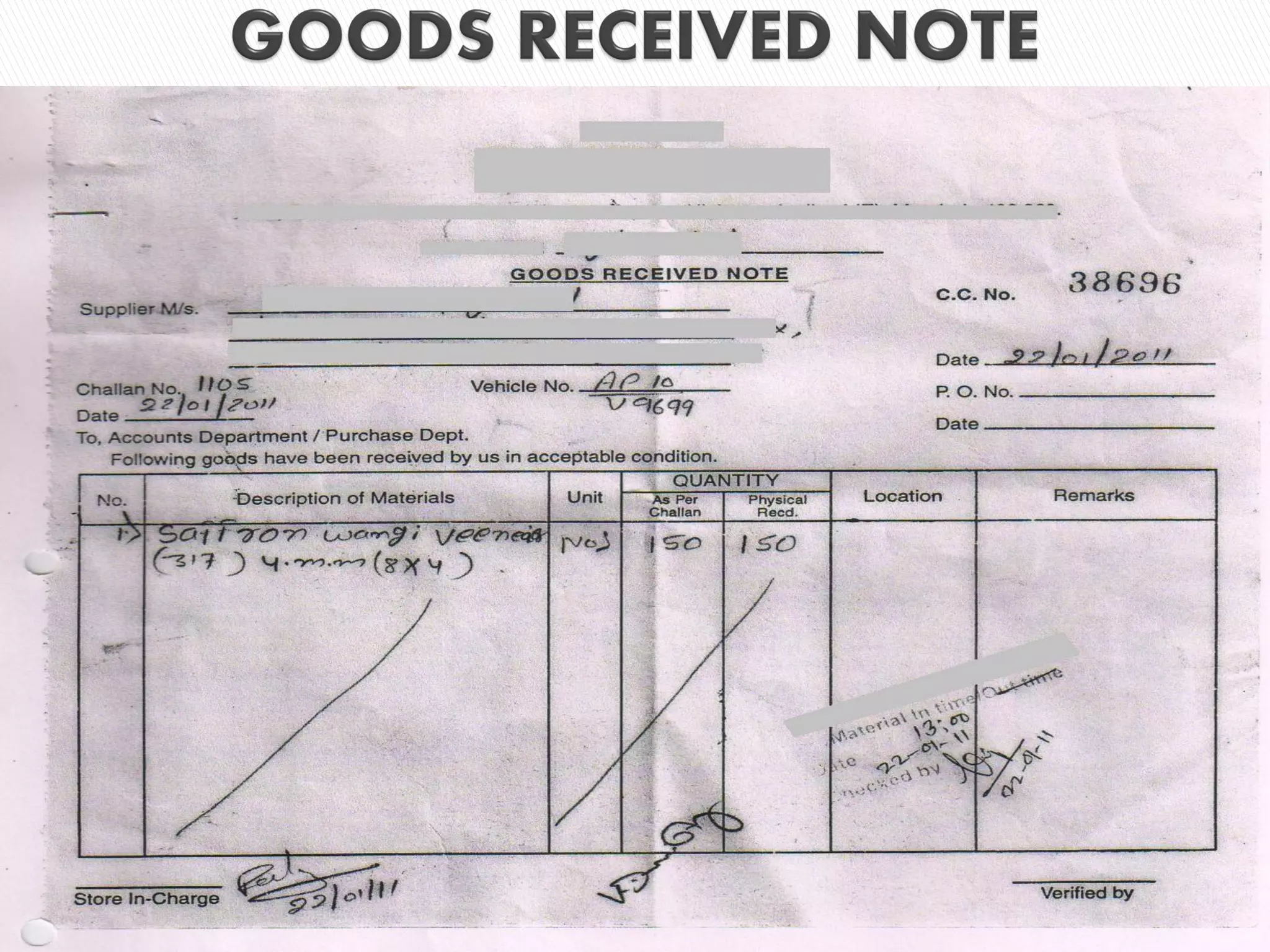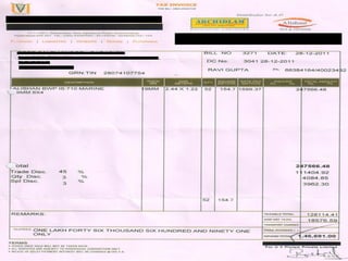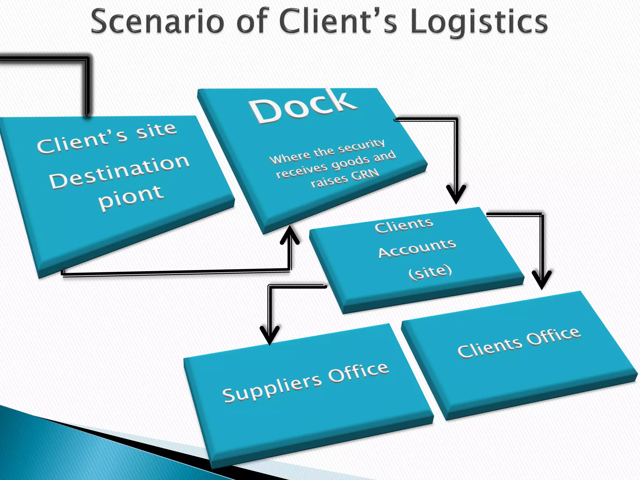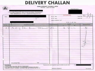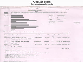The document outlines the process of procurement between a client and supplier. The client issues an indent, and the supplier provides a quotation. Negotiations then take place between the client and supplier. If an agreement is reached, the client issues a purchase order. The supplier then delivers the goods to the client's warehouse, where a delivery note and waybill are generated. The supplier receives the goods receipt note as proof of delivery. The client's sales department raises an invoice and sends it along with the delivery note and goods receipt note to the supplier. Finally, payment is sent to the supplier by the client's finance department upon receiving the goods receipt note from accounts.