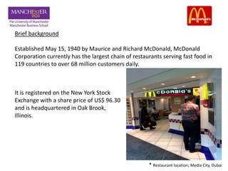 This document discusses the operational aspects of a McDonald's restaurant located in Media City, Dubai, established in 1940, which emphasizes customer experience and fast service through a global strategy called 'plan to win'. The document analyzes the restaurant's processing strategy, layout, and bottlenecks, as well as customer flow and transaction times. Recommendations are provided to enhance efficiency, improve customer navigation, and reduce pressure on service areas.
