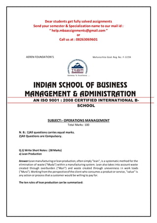 The document is a notice for students offering fully solved assignments for operations management. It outlines the structure of the assignments, including topics such as lean production, global strategies in hospitality, material requirements planning, and others, each with specified marks. Students are encouraged to send their semester and specialization details to the provided email or phone number for further assistance.
