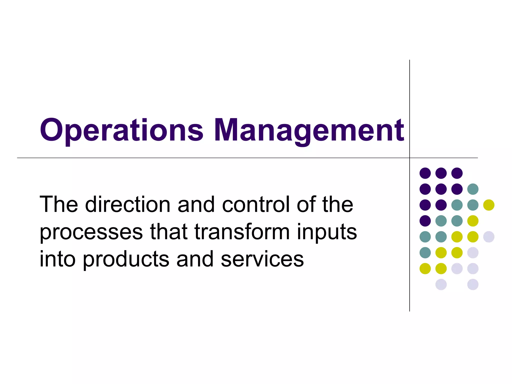 Operations management involves directing and controlling processes that transform inputs into products and services. A process takes inputs, transforms them through processing functions, adds value, and produces outputs. There are two types of customers - external customers who are end users or intermediaries, and internal customers who rely on outputs from earlier processes. Nested processes involve initiating a process within another process. Operations management principles state that all parts of an organization must design and operate processes to deal with quality, technology, and staffing issues. Decisions can be either strategic and long-term, or tactical and short-term.