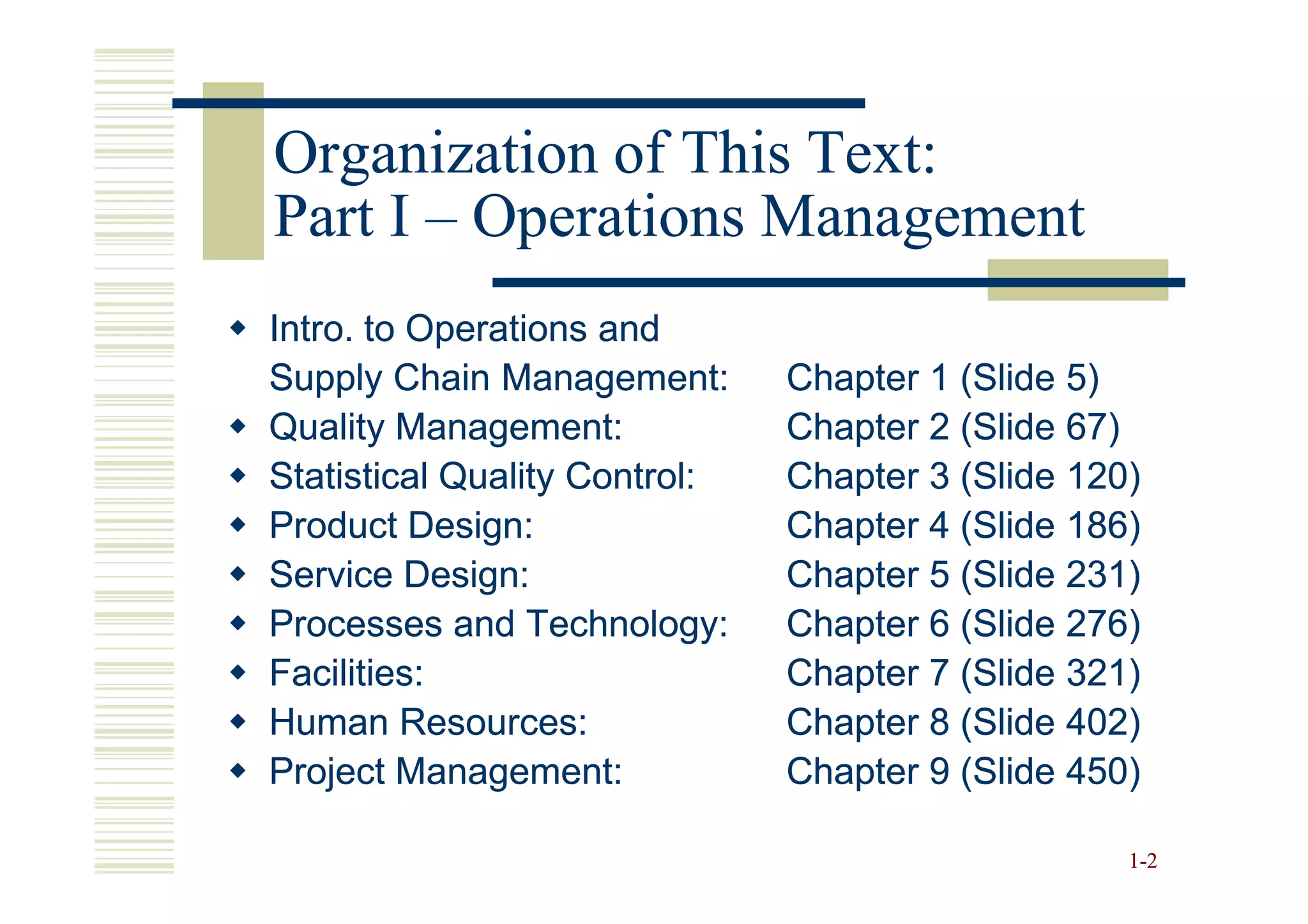 The first part introduces operations management and supply chain management concepts. It discusses the functions of operations and supply chain managers, the evolution of operations management, globalization, and operations strategy.