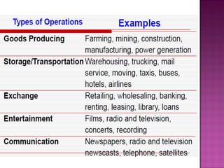 This document discusses production and operations management (POM). It defines POM as the management of direct resources, also called the 5 Ps - people, plant, parts, processes, and planning & control systems. POM lies at the heart of business activities and its ultimate objective is to produce a specified product on schedule at minimum cost. POM decisions are classified as strategic, operating, and control decisions. The document also discusses productivity measurement, factors affecting productivity, and the relationship between operations and marketing.