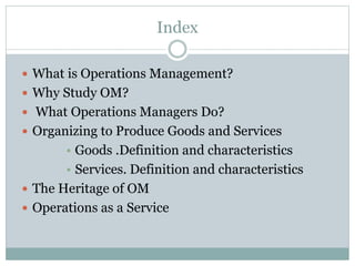 The document discusses operations management (OM), defined as the science and art of ensuring successful creation and delivery of goods and services. It outlines the significance of studying OM as it integrates various business functions, enhances productivity, and is essential in diverse industries. Additionally, it differentiates between goods and services, their characteristics, and traces the history and evolution of OM through key eras and concepts.