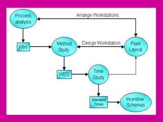 Method study breaks jobs into components, challenges processes, and develops new work instructions. Time study establishes standard times by timing job components repeatedly with a stopwatch. Incentive schemes motivate workers using standard times from time studies. Plant layout can be improved based on process analysis and work study findings.