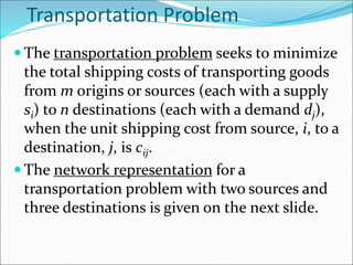 The document summarizes transportation problems and assignment problems. It discusses how transportation problems seek to minimize shipping costs by determining optimal routes from sources to destinations. Assignment problems similarly aim to minimize costs by optimally assigning workers to jobs. The document outlines the linear programming formulations and network representations of these problems. It also describes specialized algorithms like the Hungarian method for solving assignment problems and the MODI method for obtaining reduced costs in transportation problems.