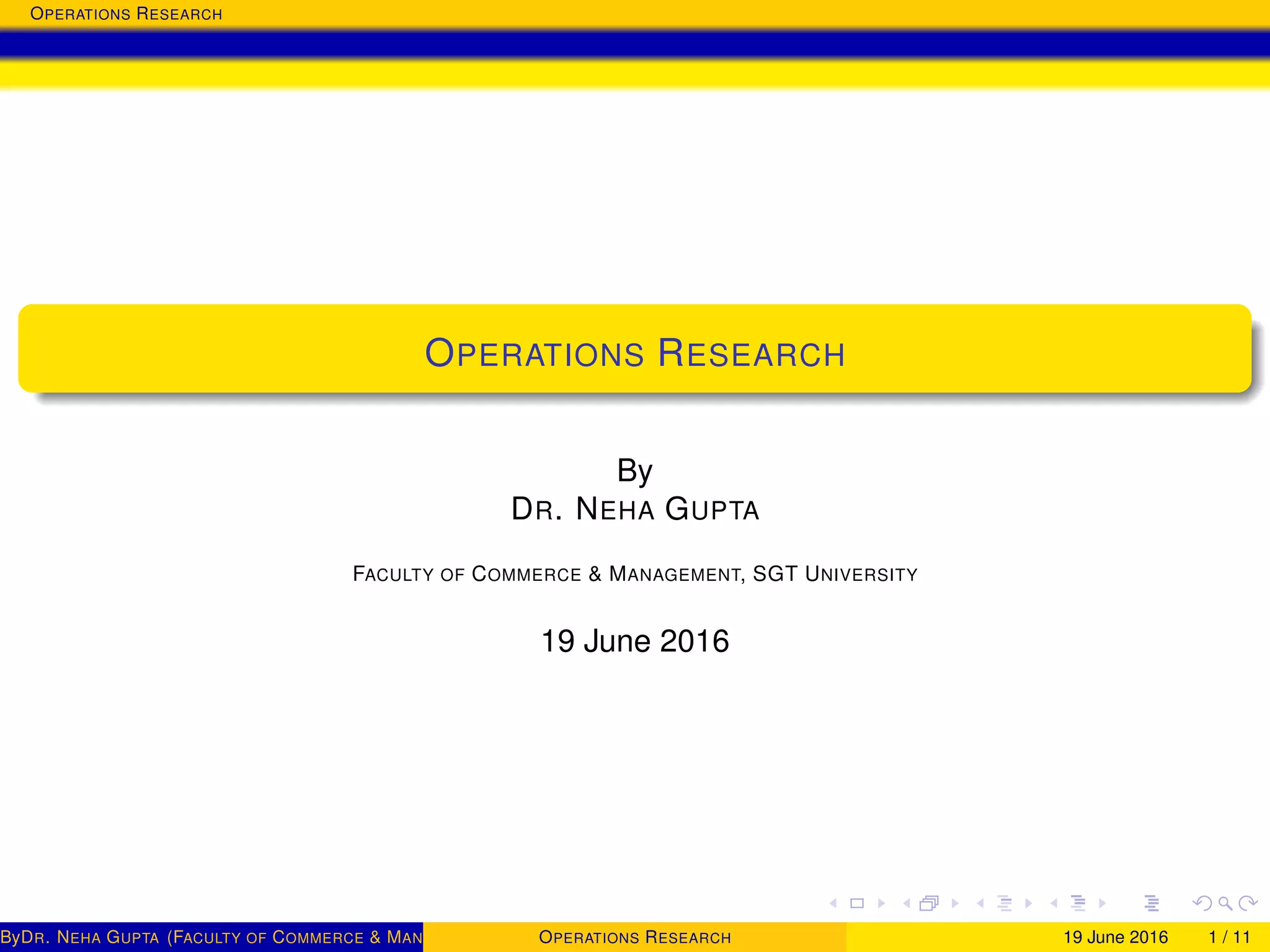 Operations research is the application of analytical methods to help decision-makers choose optimal courses of action. It originated during World War II and uses mathematical techniques like linear programming, non-linear programming, and stochastic programming to optimize resource allocation. Linear programming involves maximizing or minimizing a linear objective function subject to linear constraints. Examples of linear programming problems include product mix problems, blending problems, and production scheduling problems.