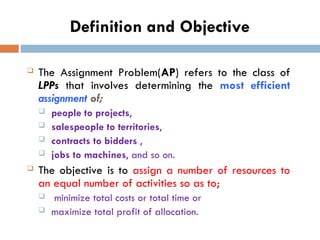 Its about Assignment problems in Operations research. It includes methods to find initial basic feasible solution and optimality test using Hungarian Method.