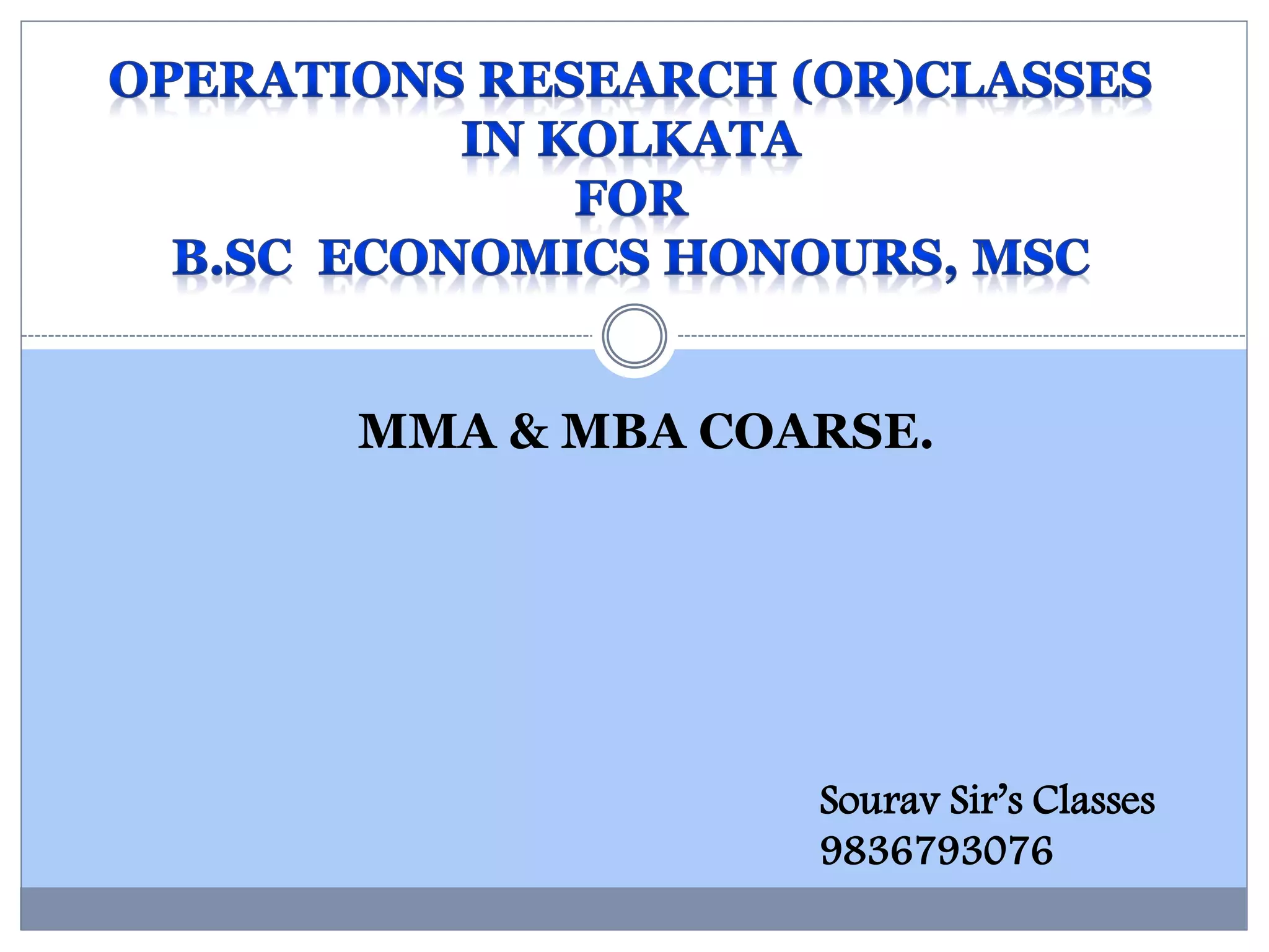 The document promotes classes for MMA and MBA courses, led by Sourav Sir, along with offerings for B.Sc. in Economics, MCA, and MSc. The classes include both theoretical and practical aspects, providing notes, suggestions, mock tests, and access to library and study materials. It also mentions internship opportunities in analysis-based firms and locations for classes.