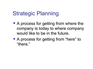 The document discusses strategic planning and operations strategy. It provides an overview of the strategic planning process, including preparing a mission statement, creating a vision, setting goals, formulating strategies, designing tactics, evaluating performance, and measuring results. It also discusses different types of operations strategies such as competing on price, quality, time, and flexibility. Examples are provided of strategic plans for individuals and companies. The document also covers topics like measuring productivity, types of productivity measures, and ways to improve productivity.