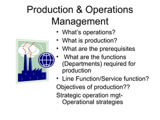 The document discusses various aspects of operations strategy. It covers defining operations strategy and linking it to corporate strategy. It also discusses developing strategies at different time horizons - strategic/long term, tactical/medium term, and operational/short term planning. Key aspects include product/service profiling, implementation of strategies, and adapting strategies to dynamic market conditions. The overall purpose is to effectively manage operations and add value for customers.