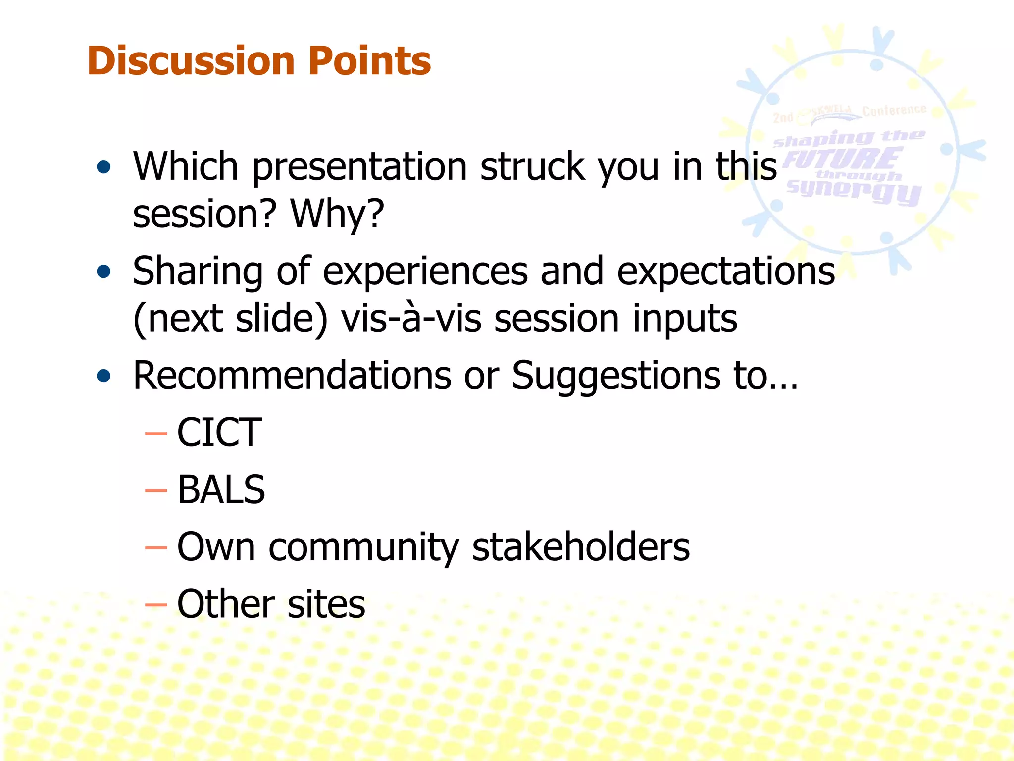 The document outlines the agenda for a workshop on operations for the Maria Melizza D. Tan eSkwela Project. It includes discussion points on presentations from previous sessions, experiences and expectations, recommendations for stakeholders, and challenges and opportunities for existing and new project sites. Participants will break into groups, assign roles, discuss the topics, and present their discussions.