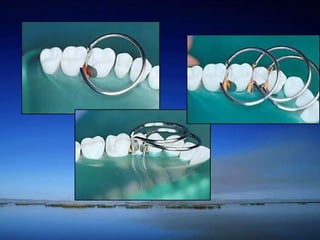 The document discusses tooth-colored restorative materials and procedures for their use. It describes different types of tooth-colored materials including composite resins, glass ionomer cements, and compomers. It also discusses dental adhesion/bonding systems and the development of dentin bonding agents. Cavity preparation designs for tooth-colored restorations include conventional, beveled conventional, and modified preparations. The clinical procedure for placing a tooth-colored restoration involves local anesthesia, isolation, cavity preparation, acid etching, bonding agent application, composite insertion, and finishing procedures.