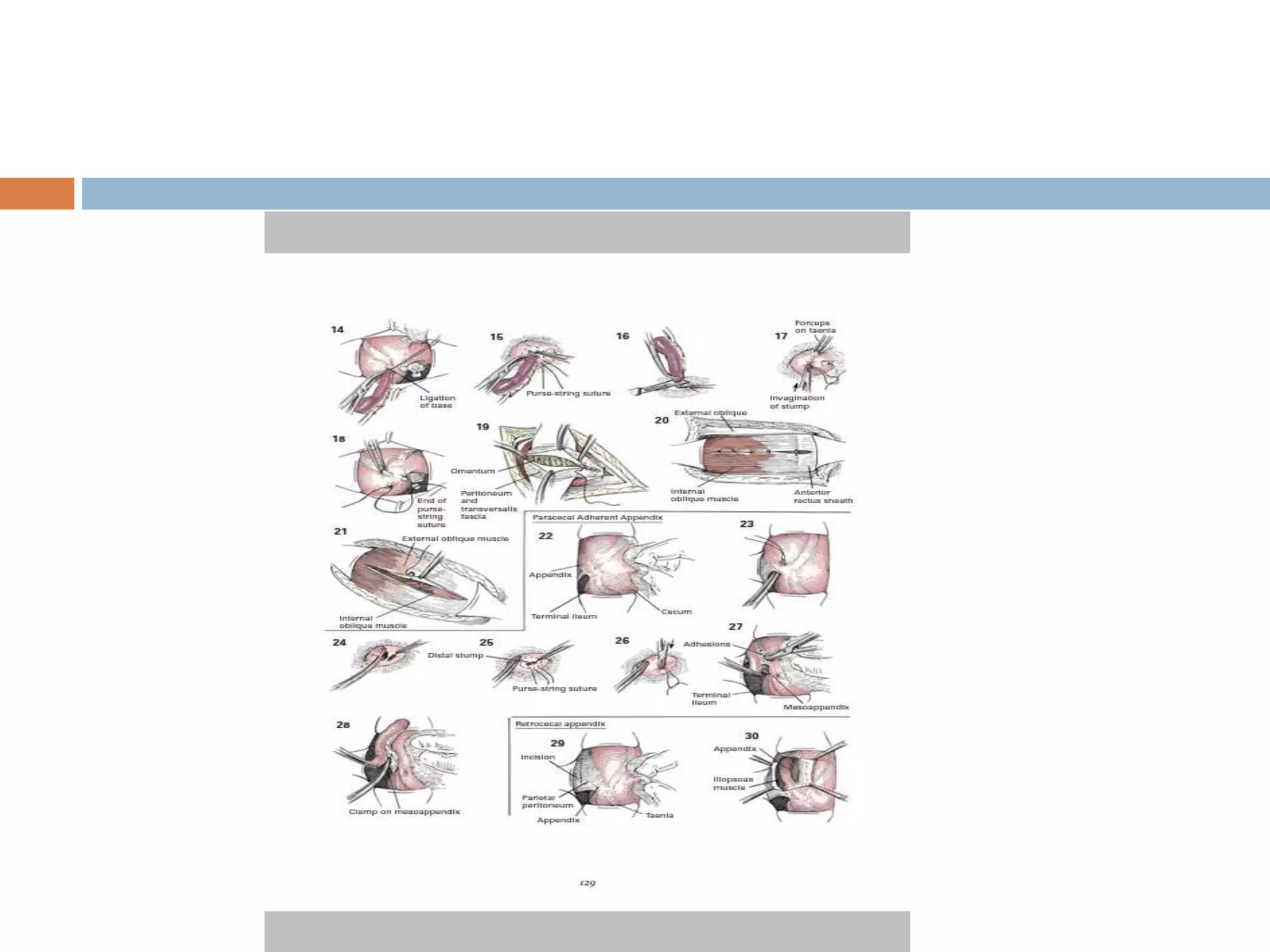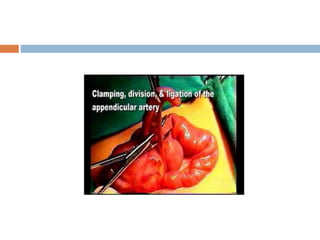 This document outlines the steps in an open appendectomy procedure. It begins with a description of surgical anatomy including variations such as ectopic or absent appendix. It then discusses pre-operative preparation, incision sites, and identification of the appendix. The key steps are: delivering the cecum into the wound, identifying the appendix base, applying clamps and removing the appendix from tip to base while ligating vessels. The appendix is then ligated and the stump may be cauterized before closing tissue layers and applying dressings. Variations for complicated cases are also noted.
