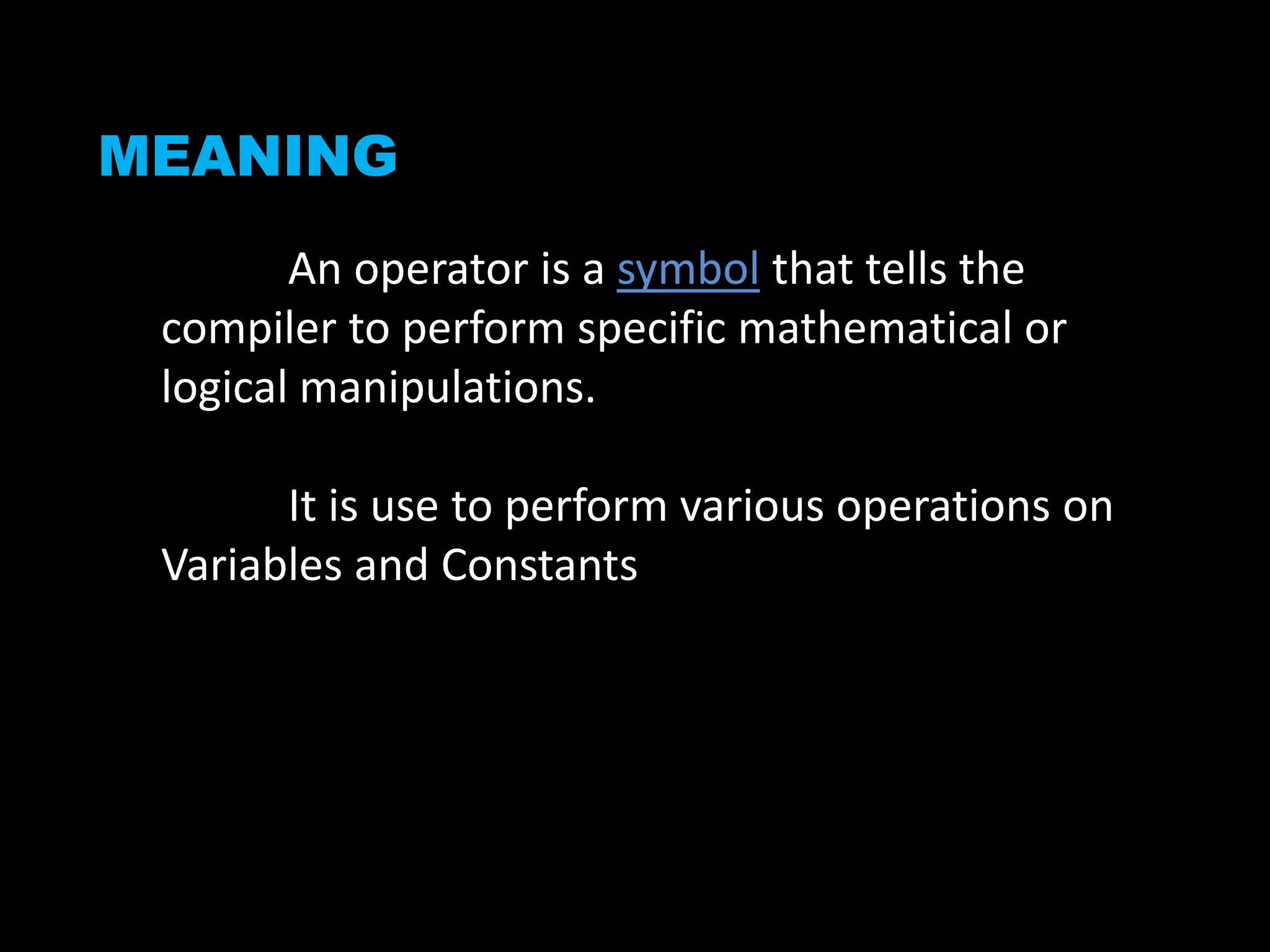 Operators are symbols that tell the compiler to perform mathematical, logical, or other operations on variables and constants. There are several types of operators including arithmetic, unary, assignment, relational, logical, ternary, bitwise, and shift operators. Arithmetic operators represent basic math operations like addition, subtraction, multiplication, and division. Unary operators operate on a single operand, like increment and decrement operators. Assignment operators assign values, relational operators compare values, and logical operators combine conditional tests.