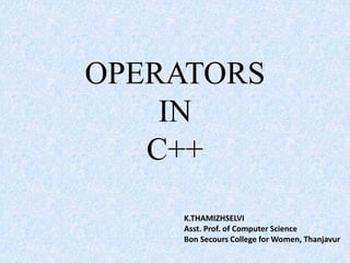 The document discusses various operators in C++ including scope resolution (::), memory allocation/release (new/delete), pointer to member declarator (::*), and manipulators like endl and setw. It explains that :: accesses global variables from inner blocks, new/delete allocate and destroy objects, and ::* and -> access class members through pointers. It also briefly mentions expression types like constant, integer, relational, and special assignment expressions involving chained, embedded, and compound assignment.