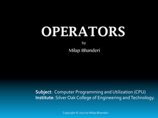 The document provides an overview of operators in computer programming, detailing their role in performing mathematical and logical manipulations. It categorizes operators into several types, including arithmetic, relational, logical, assignment, increment and decrement, conditional, bitwise, and special operators. Each operator type is explained with definitions and examples to illustrate their usage in programming.
