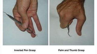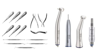 This document discusses various dental instruments used in operative dentistry. It begins by explaining how tooth preparation was initially done using hand instruments before the introduction of rotary instruments. It then categorizes and describes different types of hand instruments, including cutting instruments like chisels and hatchets as well as non-cutting diagnostic and plastic instruments. The document also covers rotary instruments like burs and their uses, and it discusses the classification and functions of various dental handpieces.