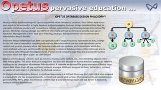 The Opetus database design philosophy emphasizes efficient management of multi-company and multi-year data through strategic data partitioning and segregation of metadata, masters, and transactions. It incorporates security measures like encryption, audit trails, and a structured approach to data storage, including the handling of binary large objects and textual attachments. Additionally, the design philosophy allows for customizable taxonomy and object lifecycle management to support diverse data storage and reporting needs.