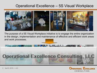 The document outlines a 5S visual workplace initiative aimed at enhancing organizational efficiency through waste reduction. It details the seven types of waste (muda) and emphasizes the importance of employee involvement and leadership in implementing lean practices. The 5S methodology (Sort, Set-in-order, Shine, Standardize, Sustain) serves as a foundational approach to establishing effective work processes and improving overall productivity.