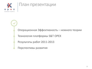 Документ рассматривает концепцию операционной эффективности, подчеркивая важность понимания принципов успеха для лидеров компаний. Описываются результаты работы и планы по оптимизации бизнес-процессов в банковской сфере, а также методы оценки эффективности, основанные на потребностях клиентов. В заключение подчеркивается необходимость постоянного совершенствования и согласования действий всех уровней управления для достижения стратегических целей.