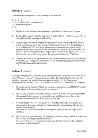 3) Problem 3 covers the "paradox of saving" where an increase in savings can decrease equilibrium income. It asks students to derive saving functions, show the effect of an increased MPS on equilibrium with diagrams, and consider how investment affects the