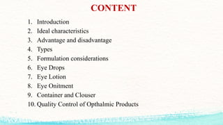The document provides a comprehensive overview of ophthalmic preparations, detailing their characteristics, advantages, disadvantages, types, formulation considerations, and quality control measures. It covers various dosage forms such as eye drops, eye lotions, and ointments, along with their preparation processes and packaging requirements. Important aspects like sterility, ocular toxicity, preservatives, and testing for quality control are also discussed to ensure effective and safe ophthalmic products.