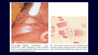 Ophthalmia neonatorum is inflammation of the conjunctiva in newborns, usually caused by bacterial infection acquired during birth. Before modern treatment, it affected 10-15% of newborns and was a major cause of blindness. While silver nitrate drops reduced chemical conjunctivitis, gonorrhea and chlamydia remain common causes. Symptoms include eye redness and discharge. Prompt treatment with topical and systemic antibiotics can cure most cases and prevent complications like corneal scarring and blindness. Proper prenatal care and treatment of maternal infections helps reduce risk.
