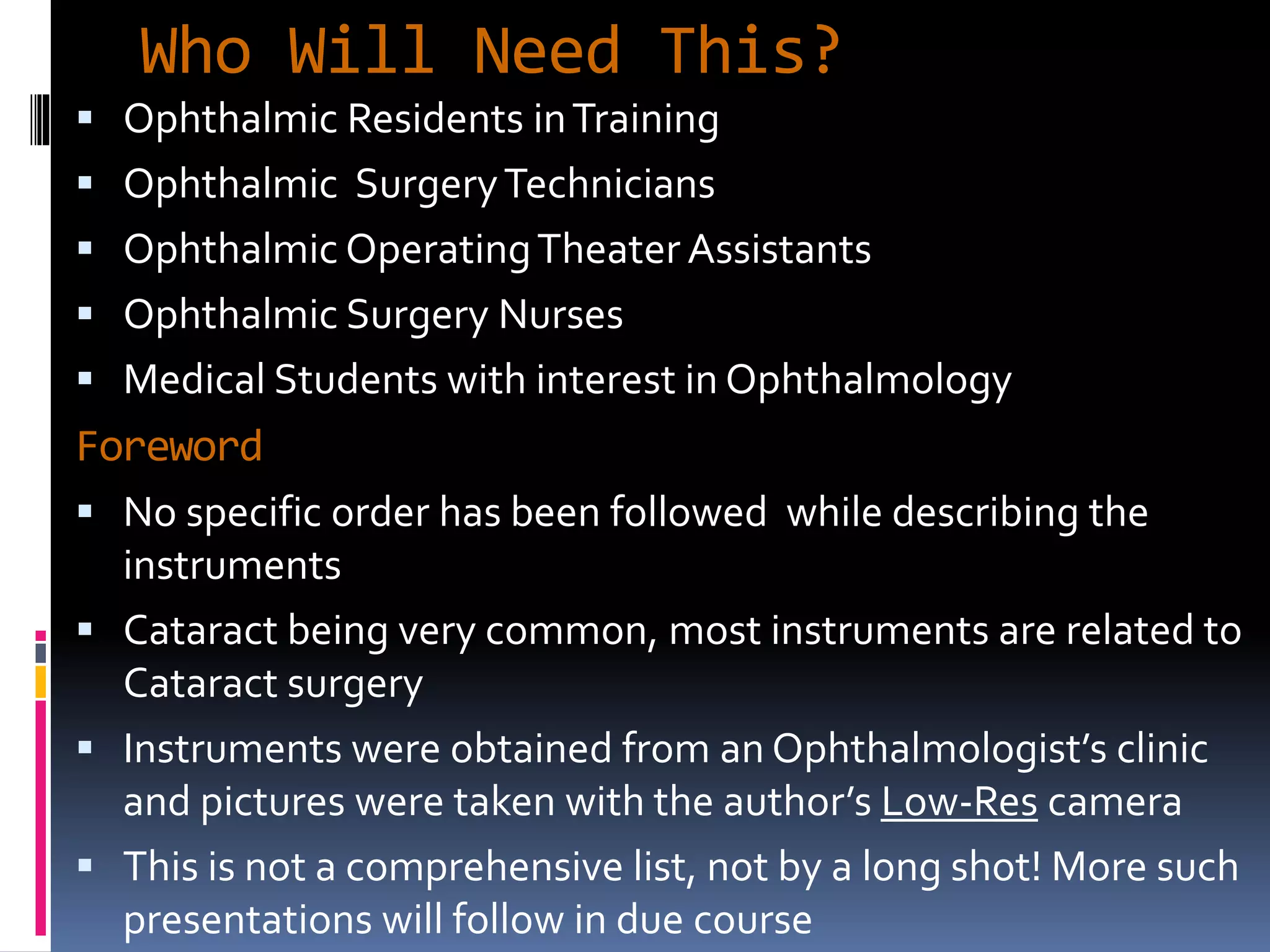 The document outlines various ophthalmic surgery instruments, their applications, and mechanical functions. It is primarily aimed at individuals involved in ophthalmic surgery, such as residents, technicians, and nurses, detailing instruments commonly used in cataract surgery. The presentation includes descriptions and images of tools like forceps, cannulae, and specula without following a specific order.