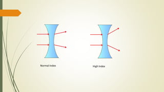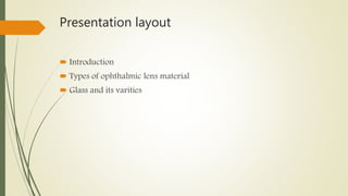 This document discusses various materials used in ophthalmic lenses. It describes the optical, mechanical, electrical, chemical and thermal properties of different lens materials like glass and plastics. Specifically, it provides details on the properties of different types of glass lenses including crown glass, flint glass, barium crown glass, and high index glass. It also discusses plastic lenses and highlights the use of high index lenses for higher prescriptions to reduce lens thickness.