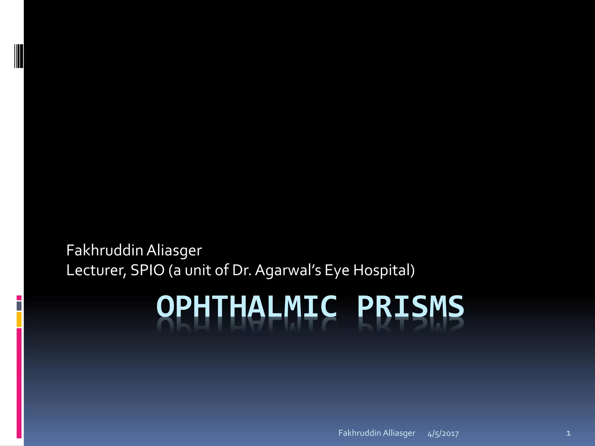 Ophthalmic prisms are thin prisms with an apical angle of less than 10-15 degrees. They are used in refractive corrections and can be prescribed for conditions like strabismus. The orientation of a prism, whether base-in or base-out, affects how the eye perceives an object through the prism. Prism power can be calculated using formulas like Prentice's rule and decompounded or recombined as needed for a prescription.