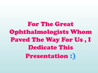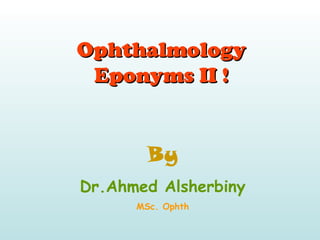 The document provides information about various eponyms in ophthalmology, including the names of the physicians they are named after and brief descriptions of the clinical findings or tests. Some of the eponyms mentioned include Fleischer ring, Hutchinson's sign, Maddox rod test, Seidel's test, Snellen chart, Arlt's line, Purkinje images, Axenfeld's syndrome, and Wernicke's hemianopic pupil. The document is intended as a reference for important historical figures in ophthalmology and clinical signs and tests named in their honor.
