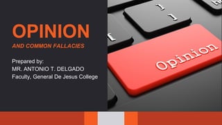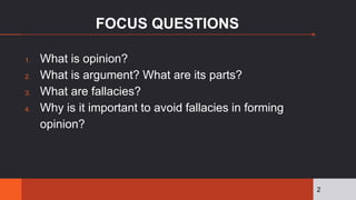 This document discusses opinion, argument, and logical fallacies. It defines opinion as a judgment that requires justification, and argument as a conclusion supported by premises. Fifteen common fallacies are explained, including ad hominem, straw man, slippery slope, and appeal to emotion. Avoiding fallacies is important for forming well-reasoned opinions based on strong arguments rather than manipulation.