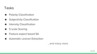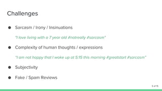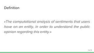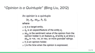 The document discusses opinion mining using data mining techniques, illustrated through a comparison of smartphones, particularly the OnePlus X and Moto G. It highlights different types of opinions and classifications related to entities and their features. The content includes references to emotional aspects of opinion formation.