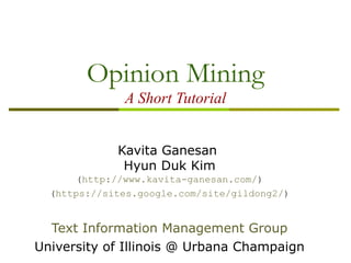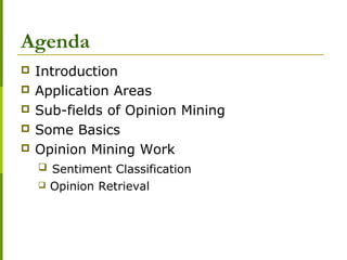 The document is a tutorial on opinion mining, discussing its significance in extracting sentiments and opinions from various sources such as blogs and reviews. It covers essential concepts, application areas, sub-fields like sentiment classification and opinion retrieval, and challenges like fake reviews and information overload. The tutorial also outlines methodologies for analyzing opinions, including sentiment classification approaches and the importance of understanding user sentiment for businesses.
