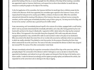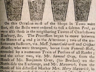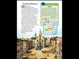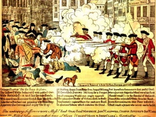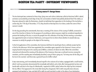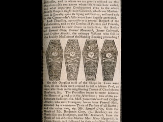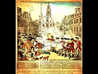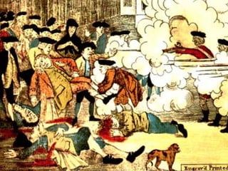 The document provides differing viewpoints on the events of the Boston Massacre from multiple eyewitnesses, including colonists, British soldiers, and those who were neutral. It includes testimony from Captain Preston, who commanded the British soldiers, as well as accounts from colonists about what precipitated the shooting and their interactions with the soldiers. The eyewitness testimonies present differing perspectives on crucial details like whether the soldiers were given an order to fire, whether they were being threatened by the colonists, and the chaotic atmosphere of the event.
